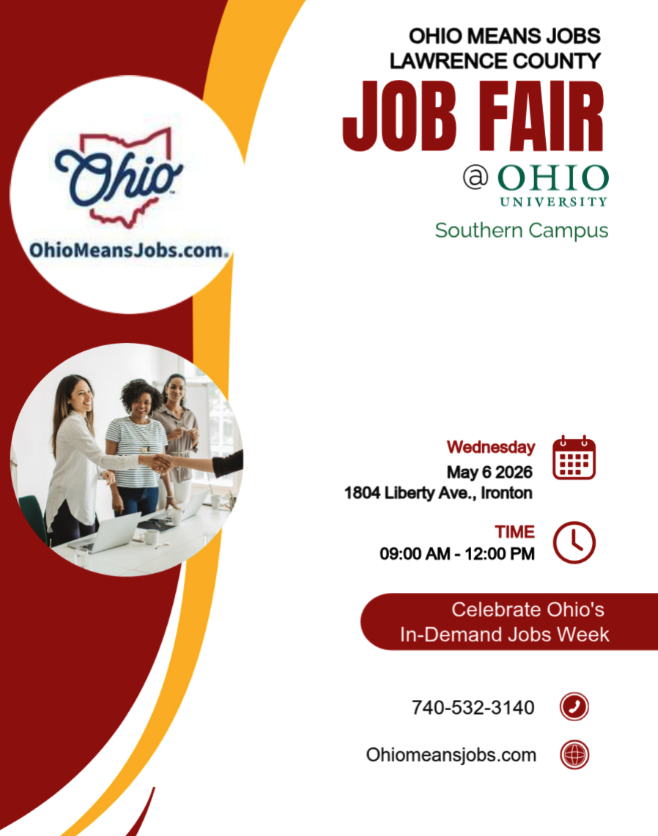 Ohio Means Jobs Lawrence County Job Fair Wednesday, May 6, 2026 9:00 AM 12:00 PM 1804 Liberty Avenue Ironton, OH, 45638 United States (map) Google Calendar ICS